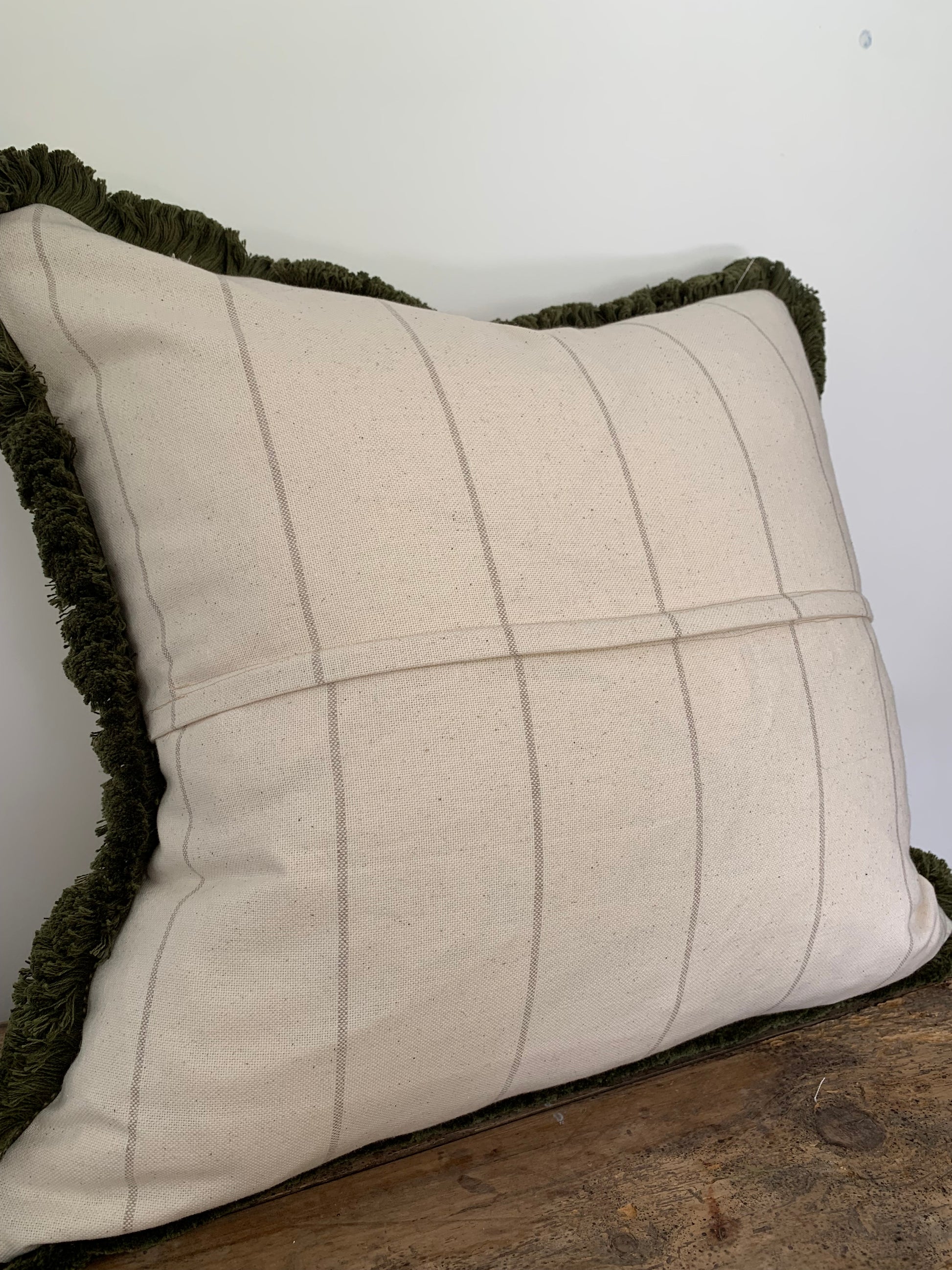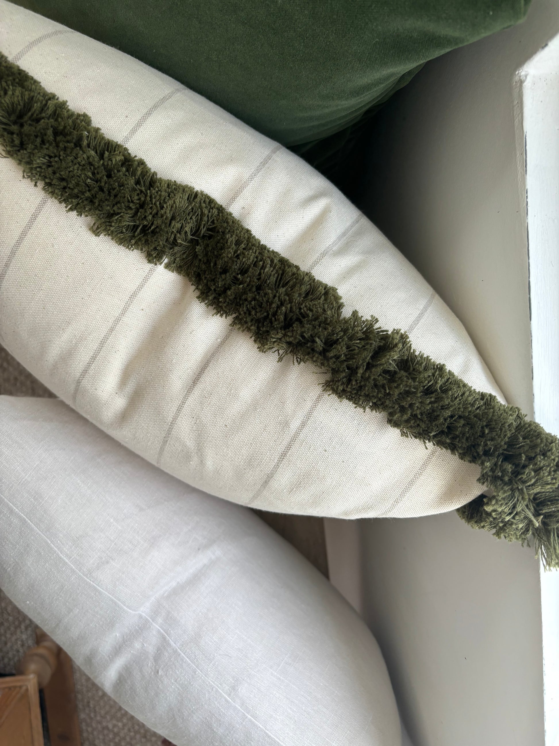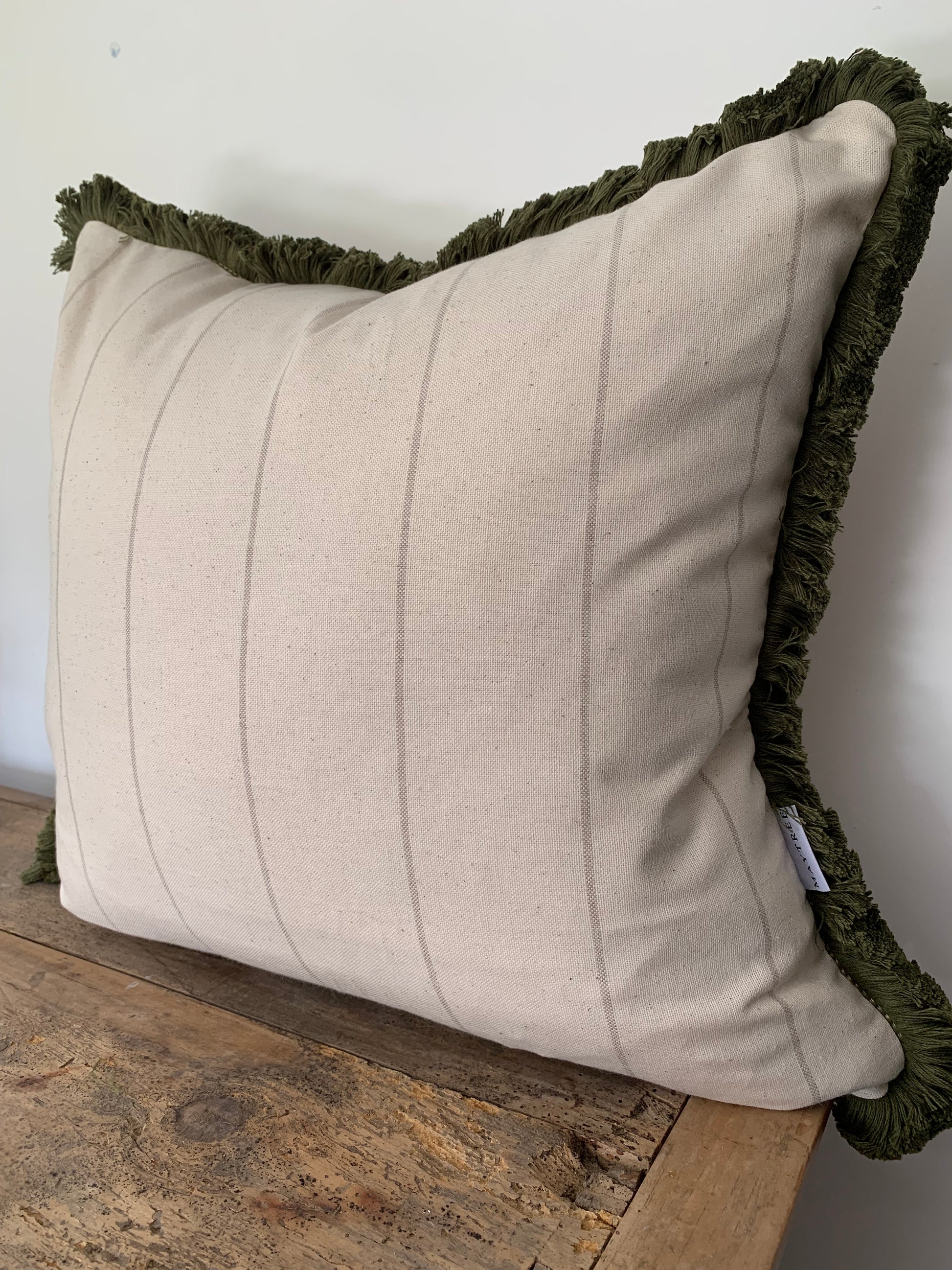 Barnaby is a 100% cotton cushion with an elegant olive green fringe trim that adds a touch of charm to any living space. He is undeniably the perfect addition to your home decor, boasting a plump feather and a simple, natural stripe that runs down his centre. This design features a hidden zip that ensures seamless beauty from every perspective.