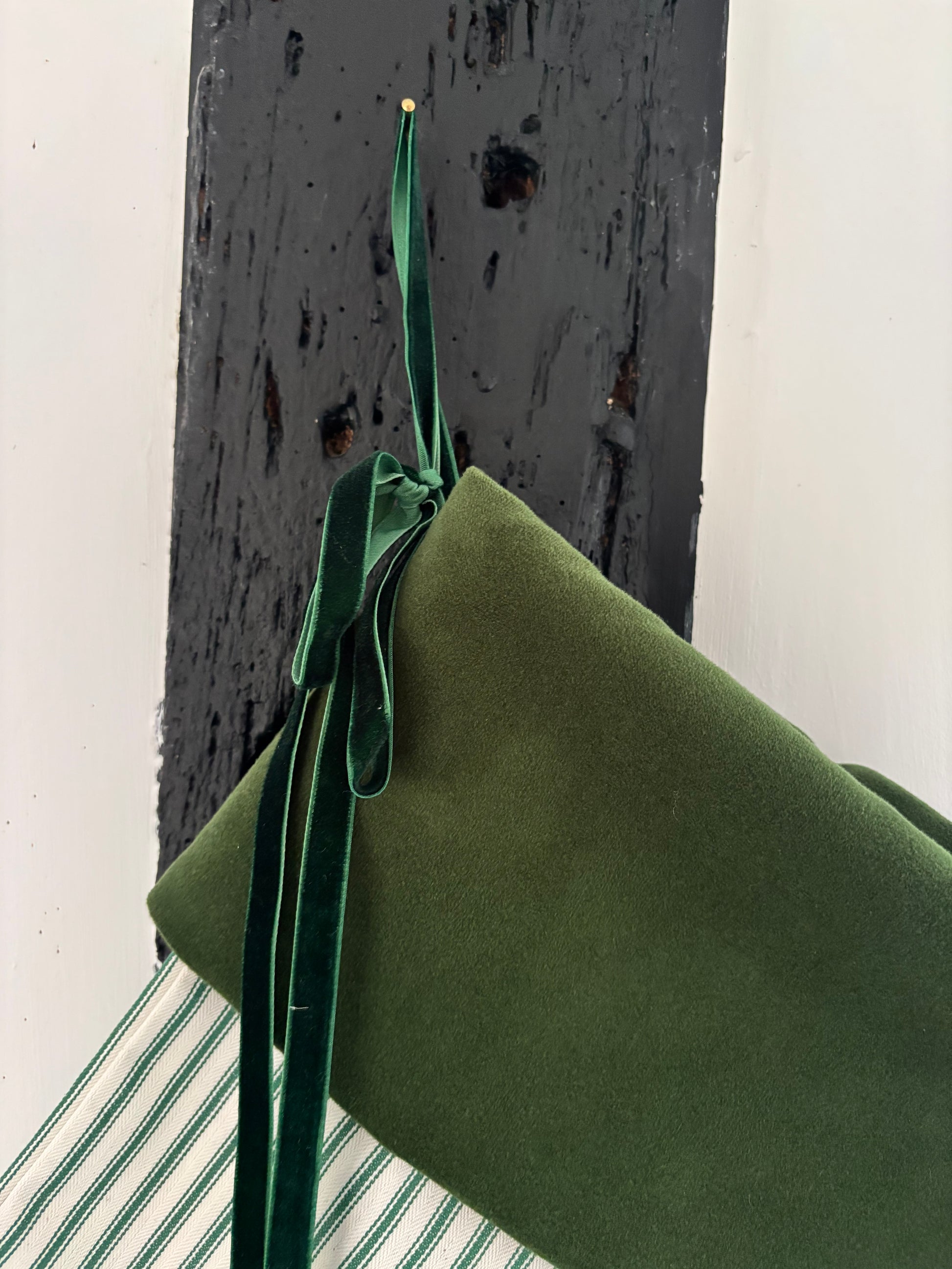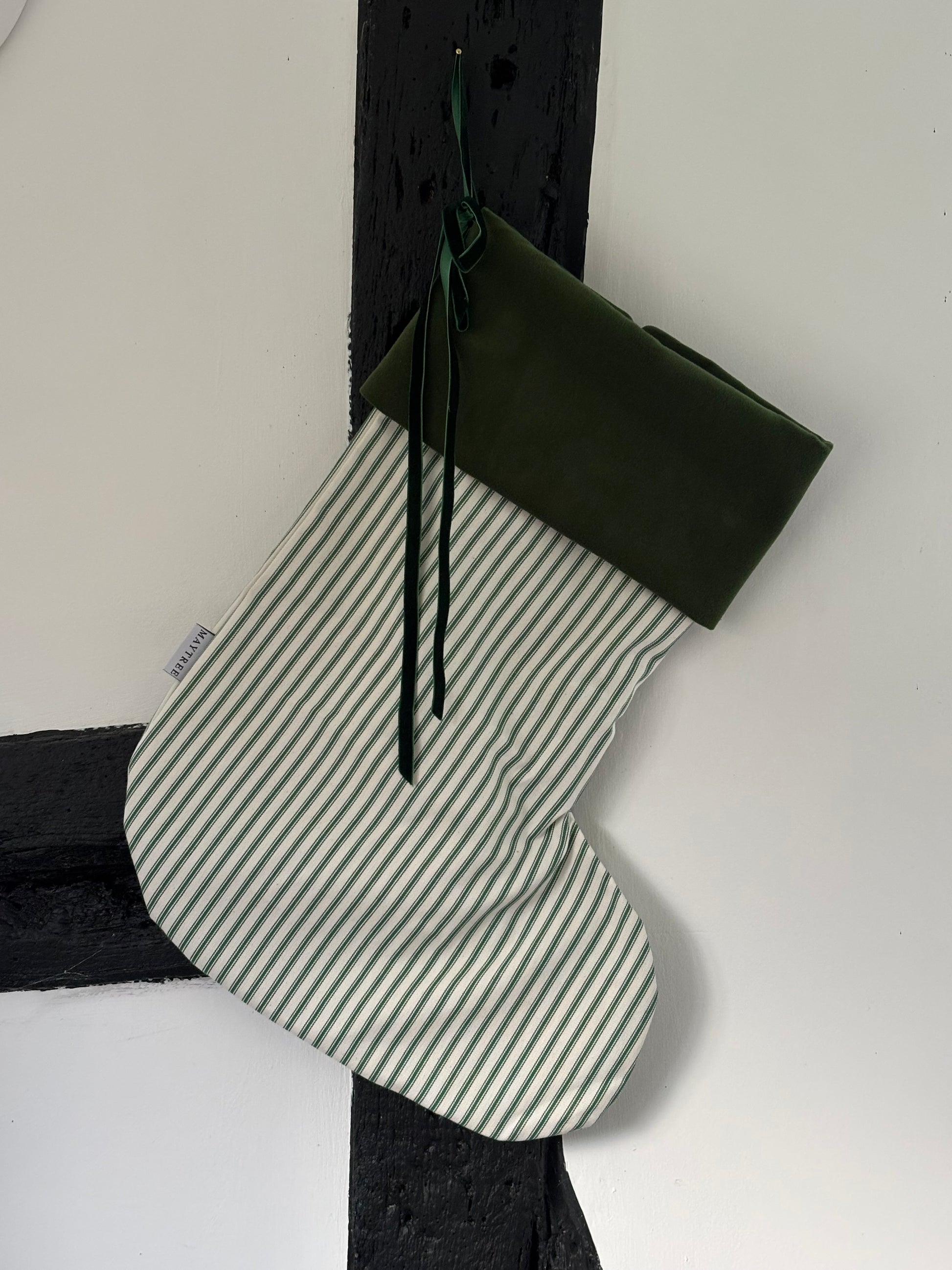 Dancer is a slightly more striking green velvet stocking. With rich deep green stripes and the softest velvet trim, it really does represent festive cheer! Whether you will use it for decoration or to fill with the perfect selection of gifts - you can't go wrong. It would sit perfectly on any mantlepiece, chair, or stairway, adding a tasteful touch to your holiday decor.
