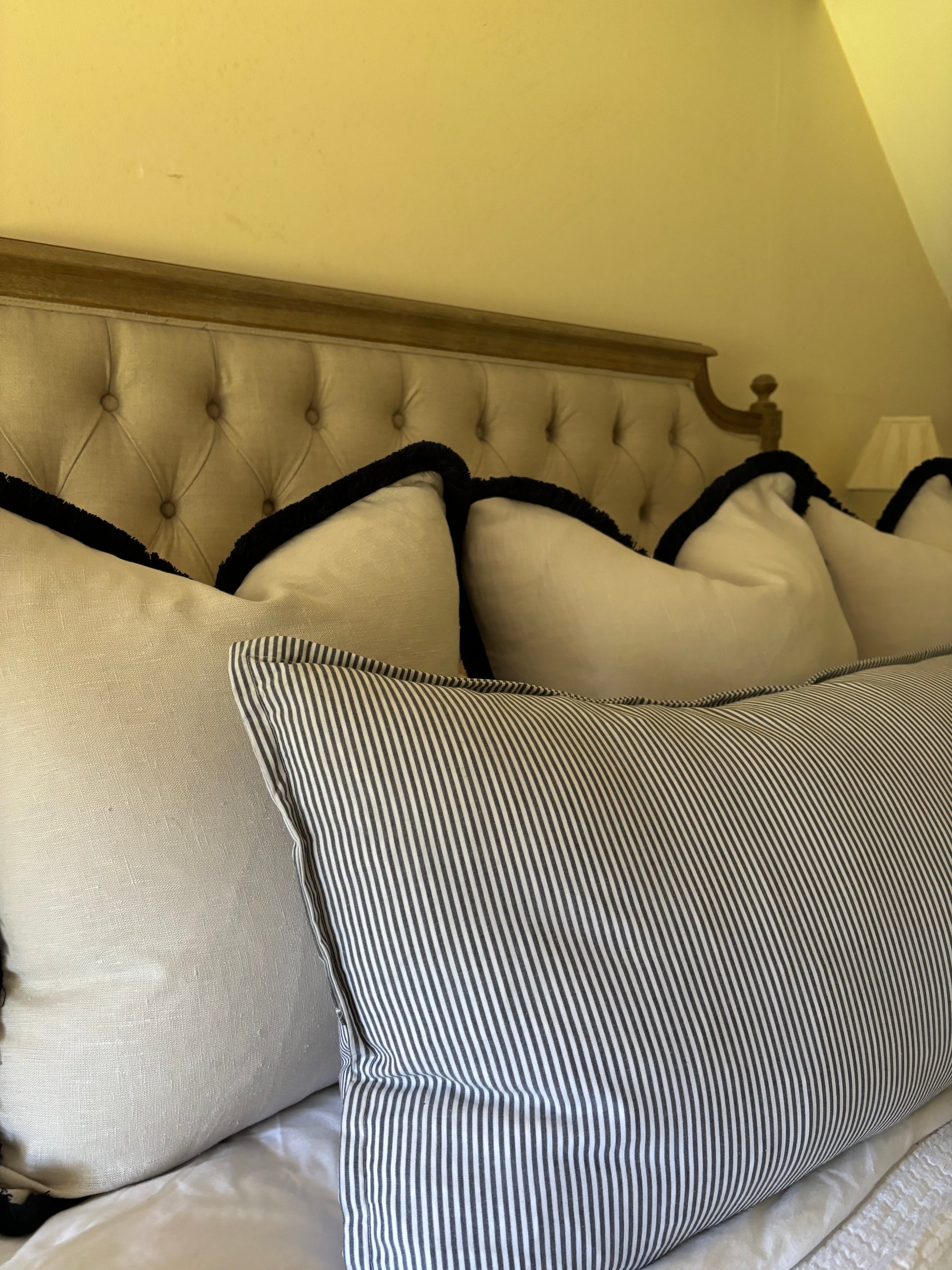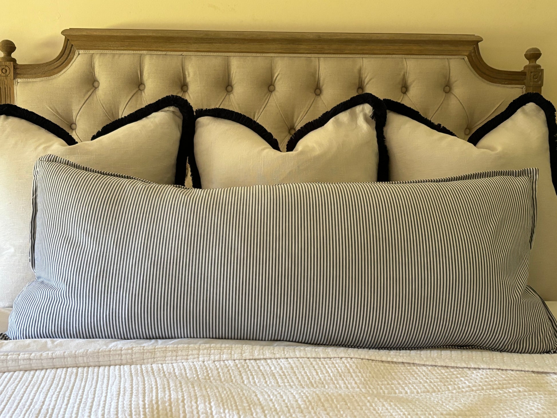 Hugo is a timeless classic among stripe cushions that effortlessly exudes charm, character, and remarkable comfort. Measuring at 40cm x 100cm, he is the ideal cushion choice for enhancing the aesthetic of a bed, sofa, or even a stylish bench. Whether placed alone as a statement piece or in front of a thoughtful arrangement of other cushions, you really can't go wrong with him! His delicate stripe pattern adds a sense of flow and movement throughout the room, and the meticulously crafted sewn edge provides just the right amount of interest and subtlety, making Hugo a truly versatile addition to your home decor.