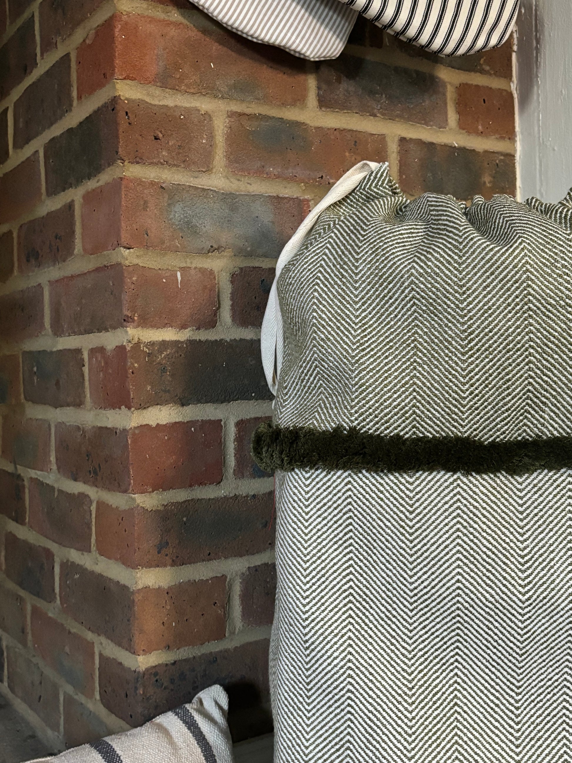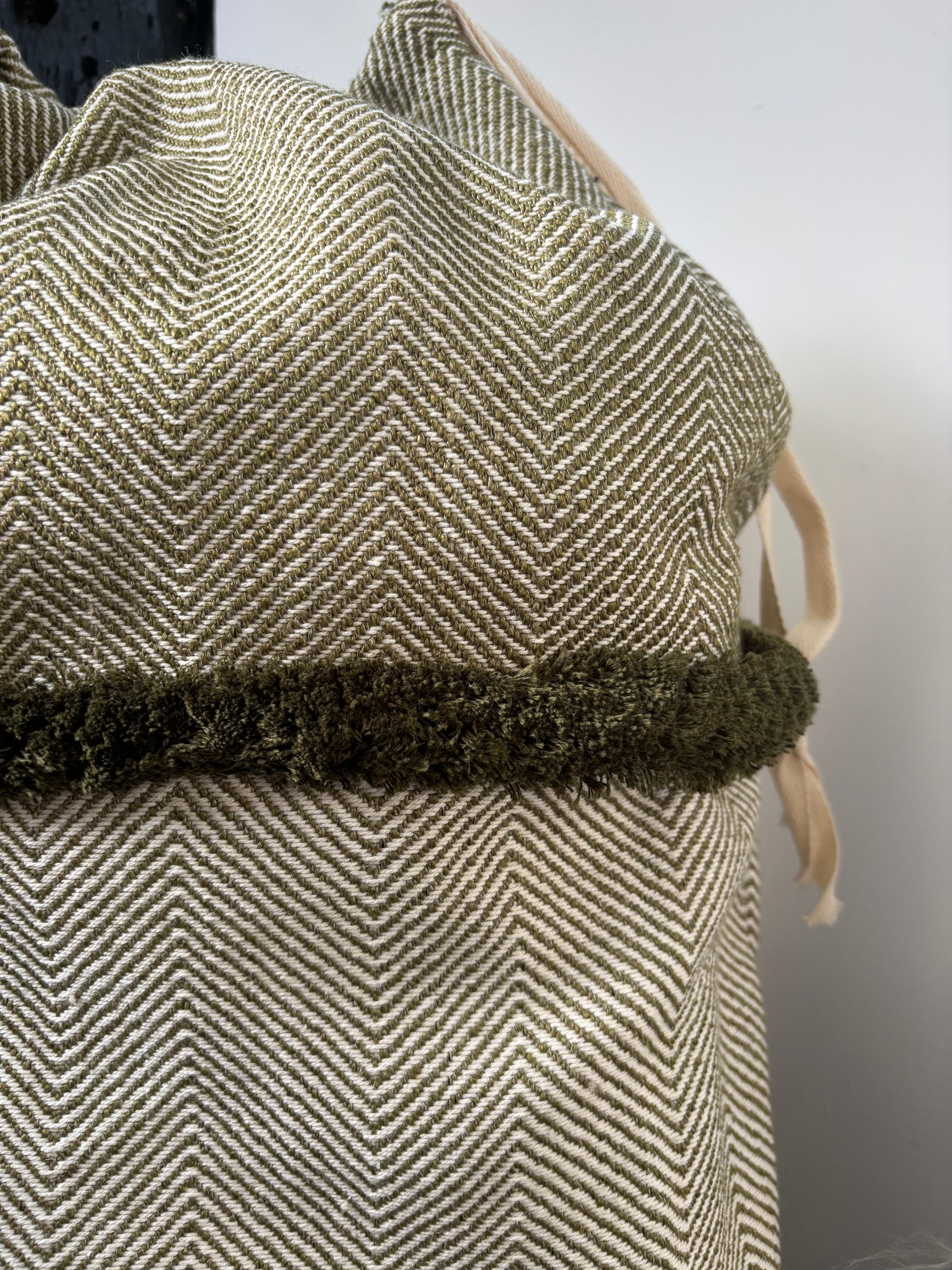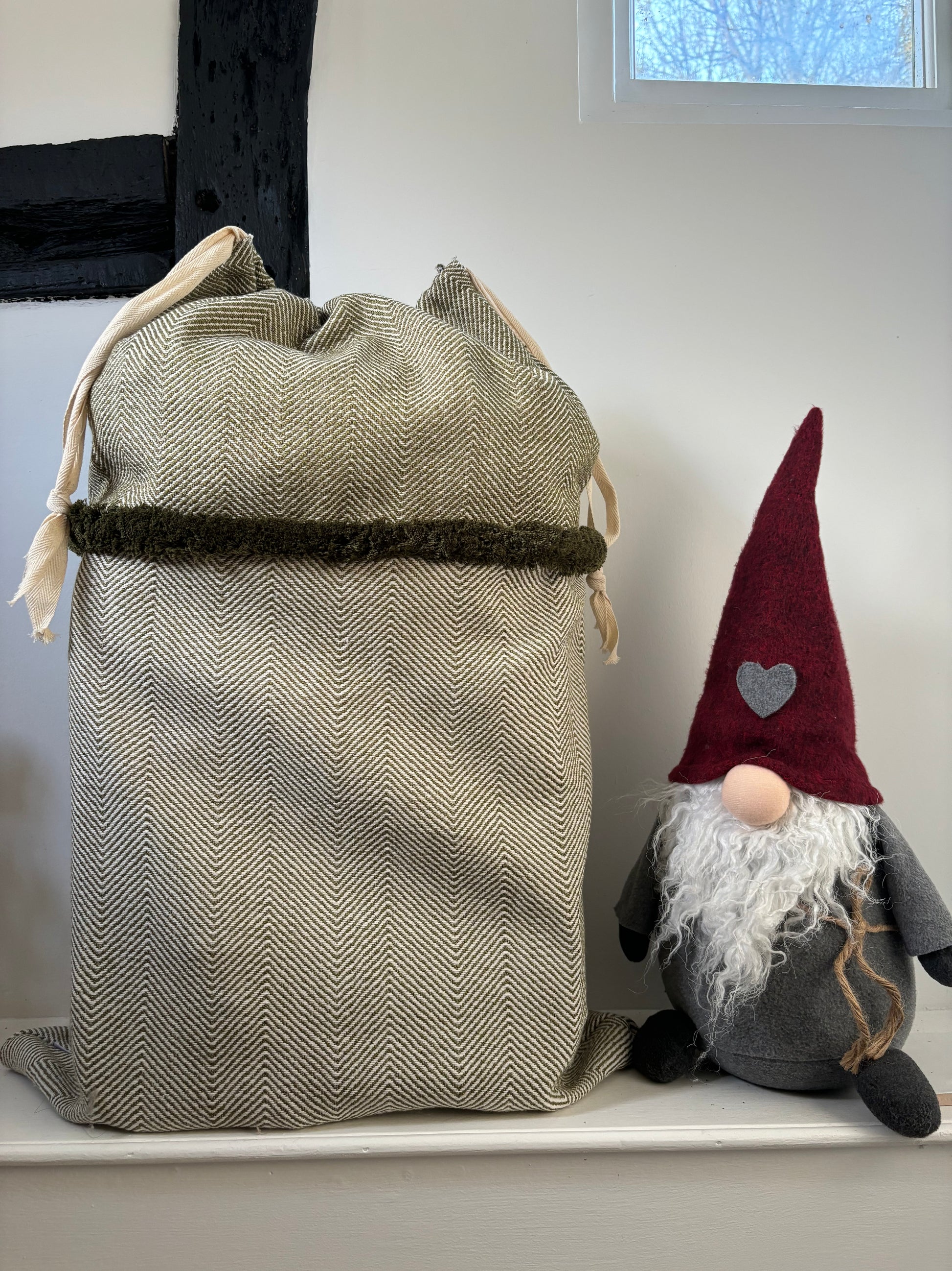 The perfect way to transport gifts, group them or wrap them. Ivy is a two tone green herringbone Christmas sack with a delicate olive green fringe. Not only can she hold all your gifts durning this time, but she is perfect for storing items in after the festive period. Additionally, Ivy serves wonderfully as a decorative sack that can be displayed throughout the year, enhancing your home’s aesthetic with her charming appearance.