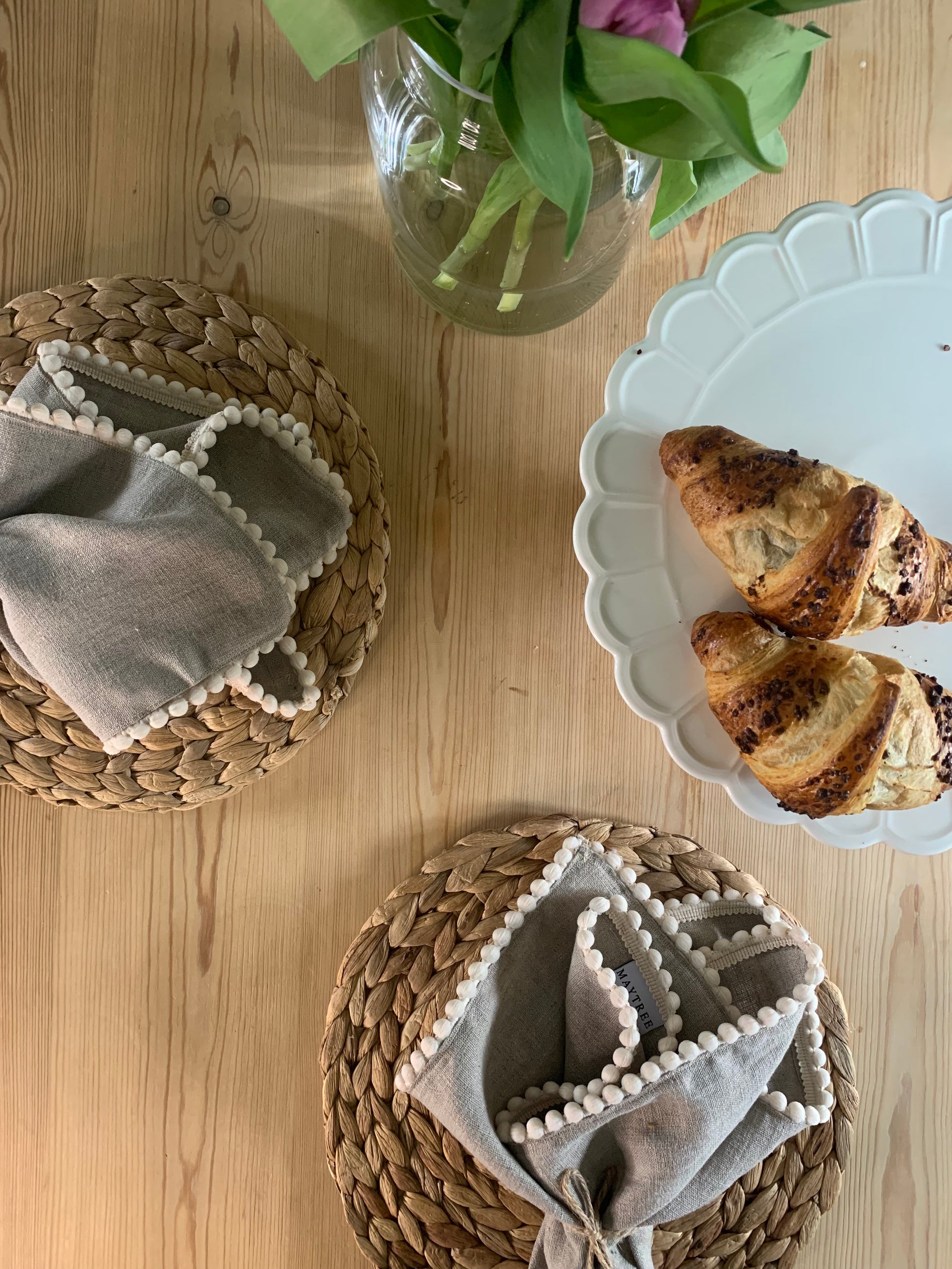 Sold as a pair, our elegant Mabel napkins are carefully crafted from 100% luxurious linen with a carefully selected and applied pom-pom trim. The delicate pom-pom trim not only enhances their charm but also brings a subtle playfulness to your dining experience. With their softness and practicality, these napkins effortlessly elevate any meal, making them an essential element for creating a welcoming atmosphere at any gathering.