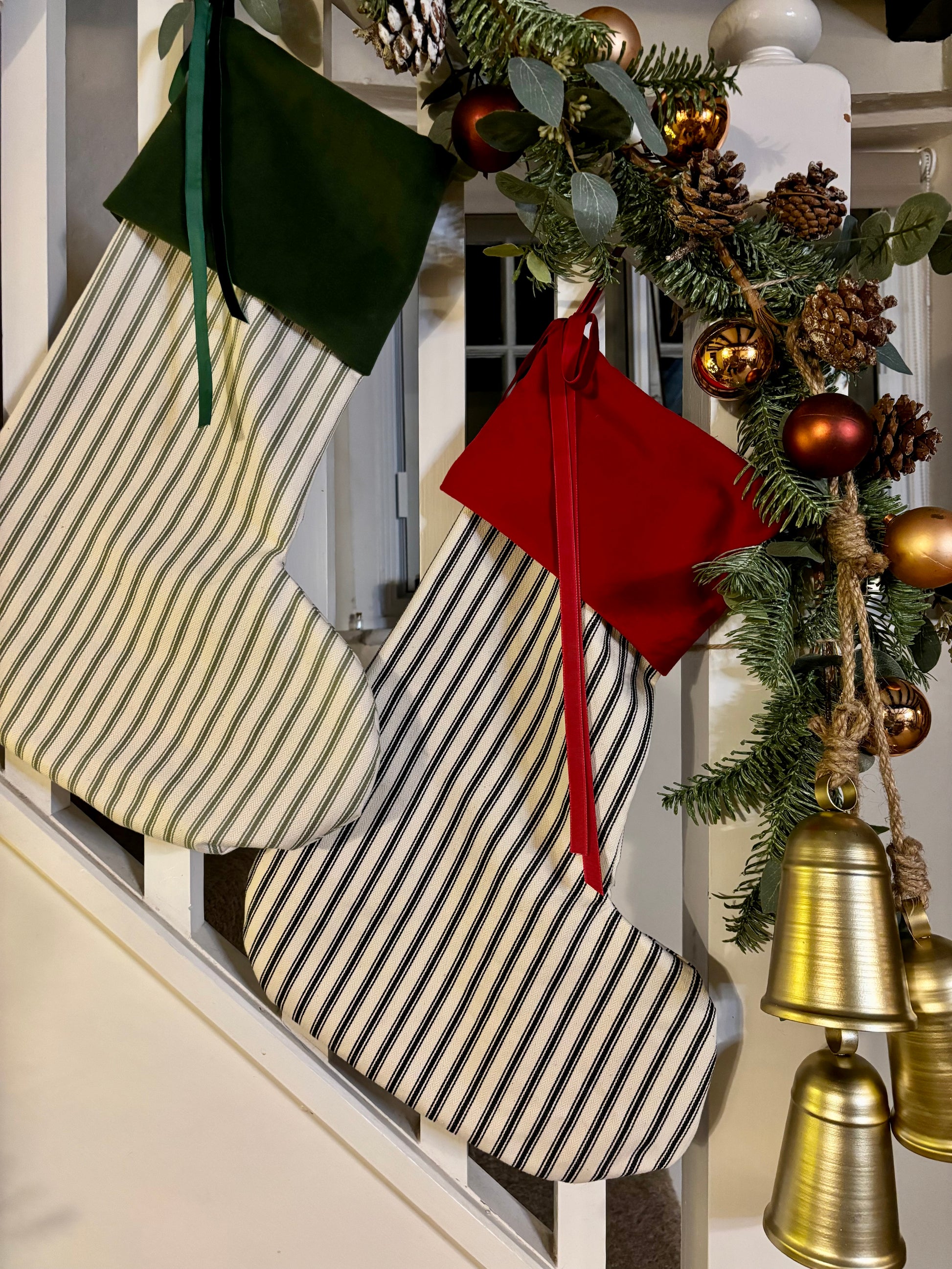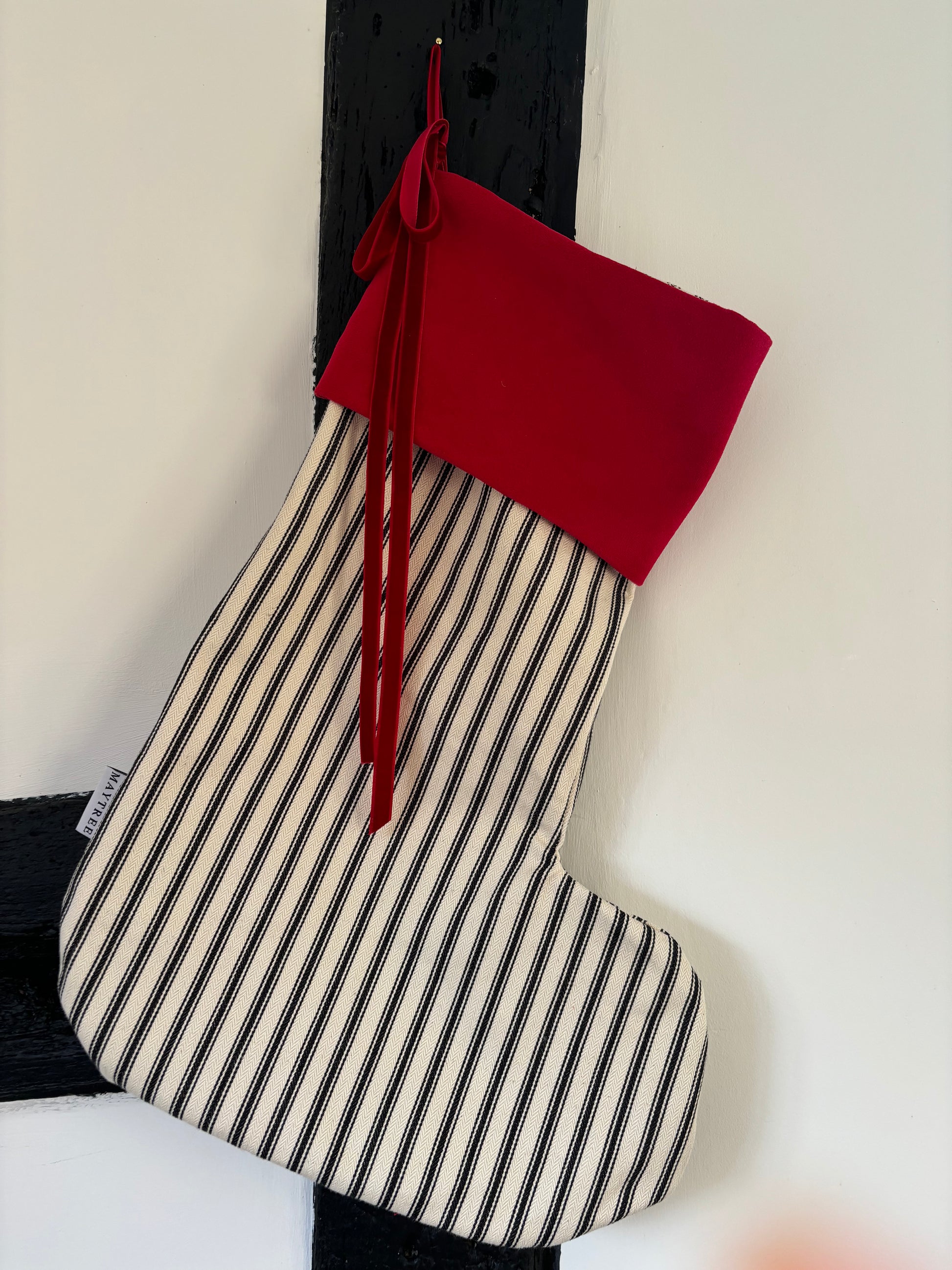 Mince pies, warm milk, festive reindeer food, and a cosy Maytree stocking are exactly what you need to truly welcome the magic that this wonderful Christmas season brings. The Noel stocking, adorned in beautiful black and off-white ticking stripes, is elegantly complemented by a rich and luxurious red velvet trim. Featuring a delicate red velvet bow that gracefully drapes down the side, it’s everything you could possibly desire this holiday season, adding a delightful touch to your celebrations.