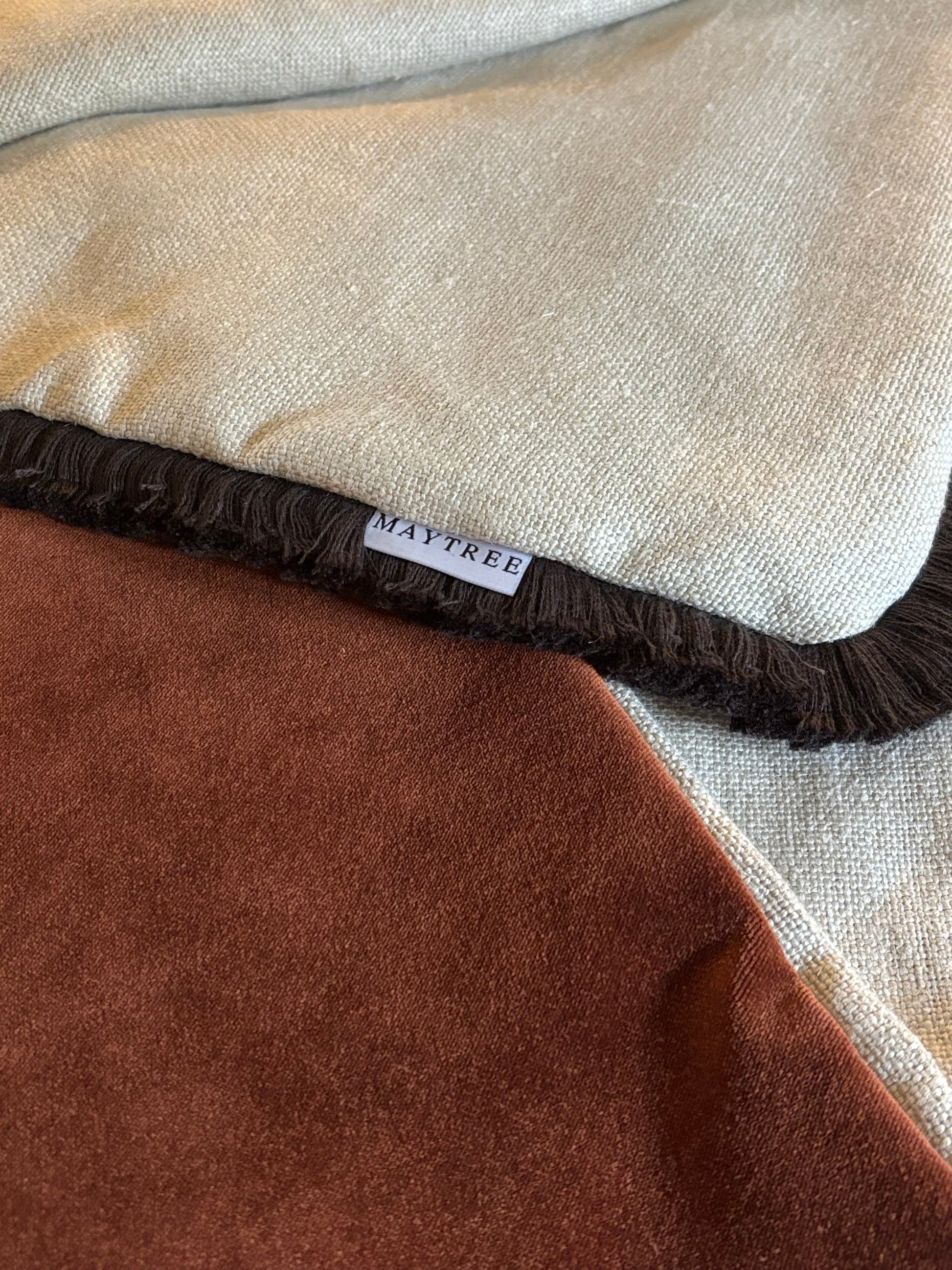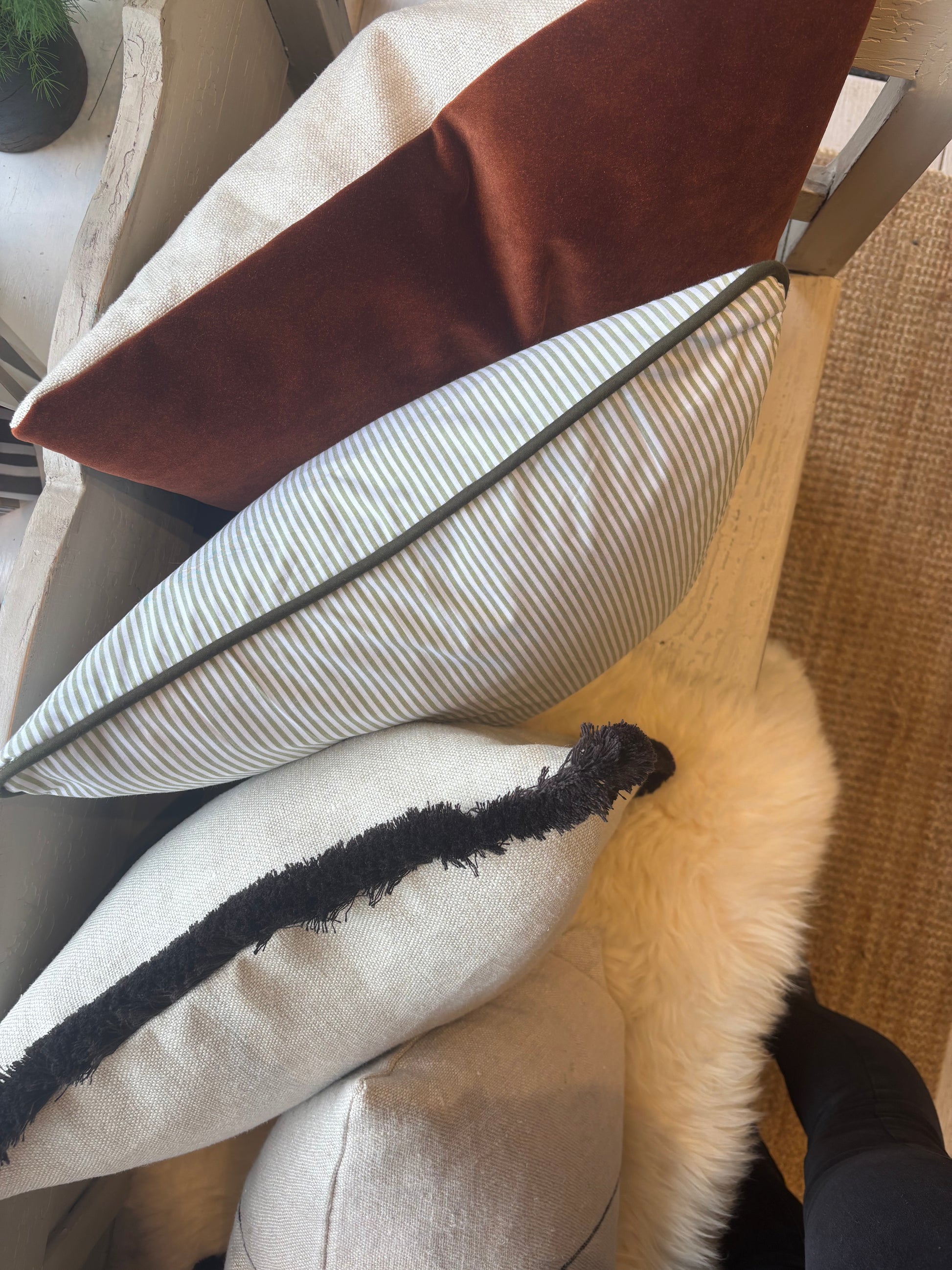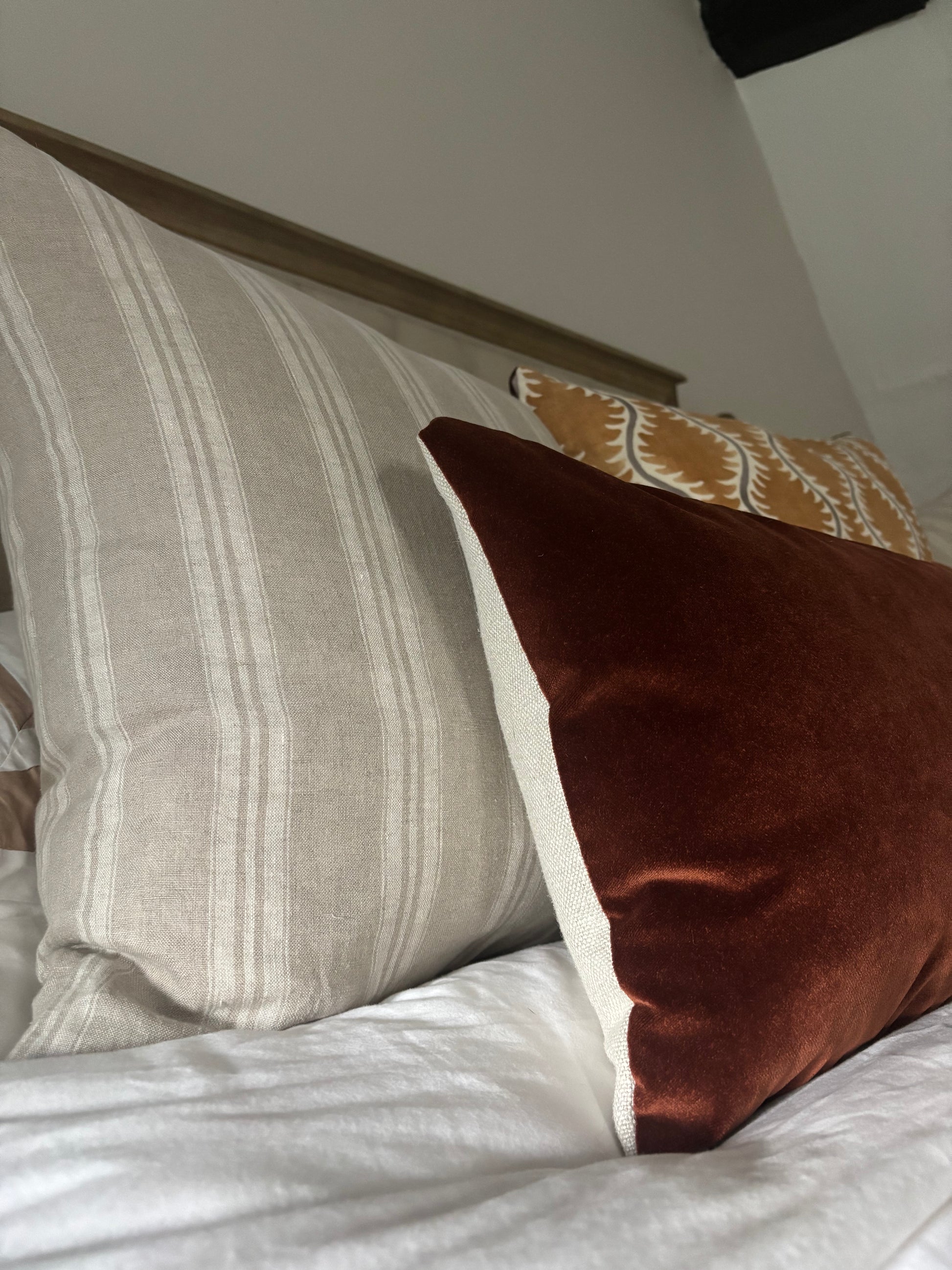 Seraphina was created as the seasons started to change and Autumn came around. It has the perfect, luxurious burnt orange front with a neutral, soft linen back. Making it perfect for all year round. Featuring an invisible zip it can face both ways and still be just as beautiful in its setting. It really is a perfect cushion!